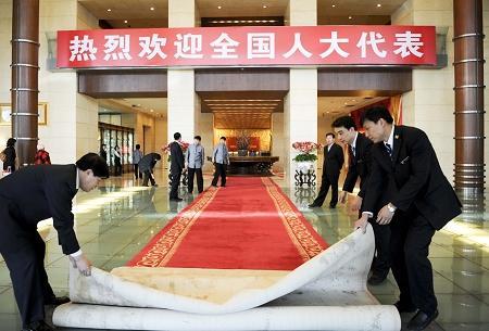3月2日下午,北京饭店工作人员铺红地毯欢迎即将抵达的全国人大代表。(资料图片)